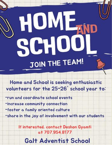 The Home and School Association is Galt Adventist School's parent organization. It serves to draw the home, church, and school closer together into a positive working relationship.